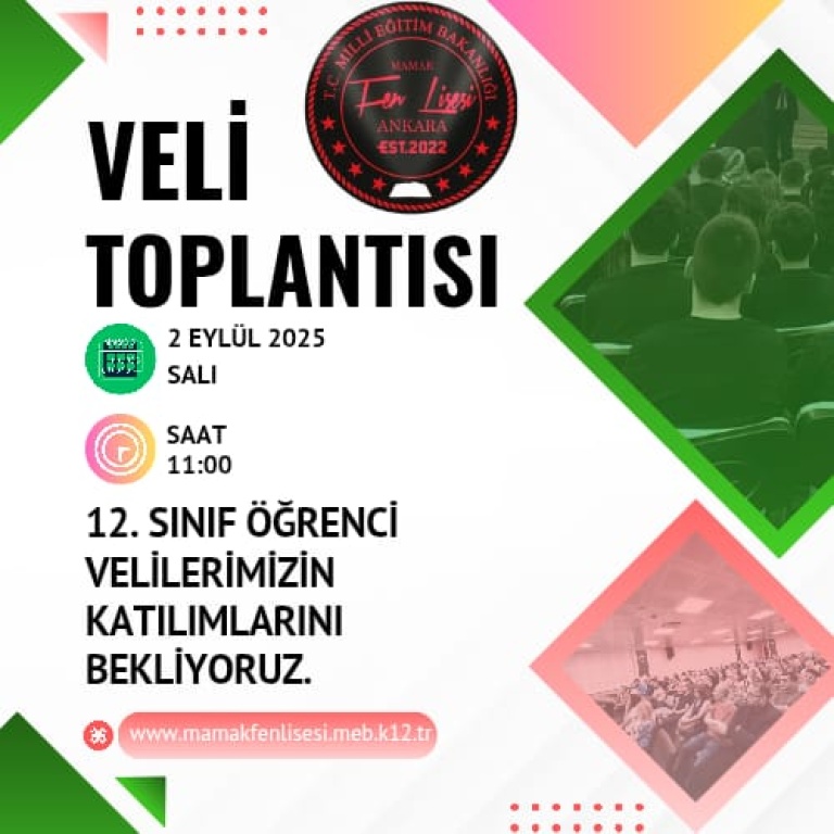 12. Sınıf Öğrenci Veli Toplantısı 2 Eylül 2025 Salı günü saat 11:00' da Okulumuz Konferans Salonunda Yapılacaktır. Velilerimizin Katılımlarını Bekliyoruz.